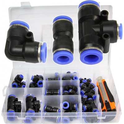 Sada spojok na vzduchovú hadicu 4 - 12 mm 52 ksSada spojok s otvormi o priemere 4-12 mm určená pre vzduchové hadice. Slúži na pripojenie pružných vzduchových hadíc. Odolné voči...